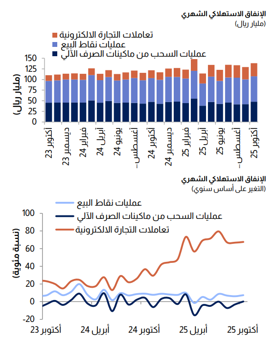 ارتفع إجمالي الانفاق الاستهلاكي في أكتوبر بنسبة 13.7%، على أساس سنوي، وبنسبة 7%، على أساس شهري. وسجلت قنوات الانفاق الثلاث الرئيسية نمواً حيث زادت عمليات نقاط البيع بنسبة 7.4%، وارتفعت تعاملات التجارة الإلكترونية بنسبة 68%. كما شهدت السحوبات النقدية، التي كانت في انخفاض مؤخراً، زيادة متواضعة بنسبة 0.2%.