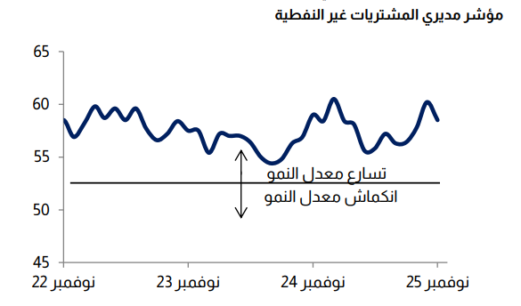 حافظ مؤشر مديري المشتريات غير النفطية في نوفمبر على مستويات قوية، مدفوعاً بقوة النشاط وارتفاع المبيعات، لكنه انخفض بشكل طفيف إلى 58.5 بعد المستويات المرتفعة التي سجلها في أكتوبر، وذلك لتباطؤ نمو الأعمال الجديدة.