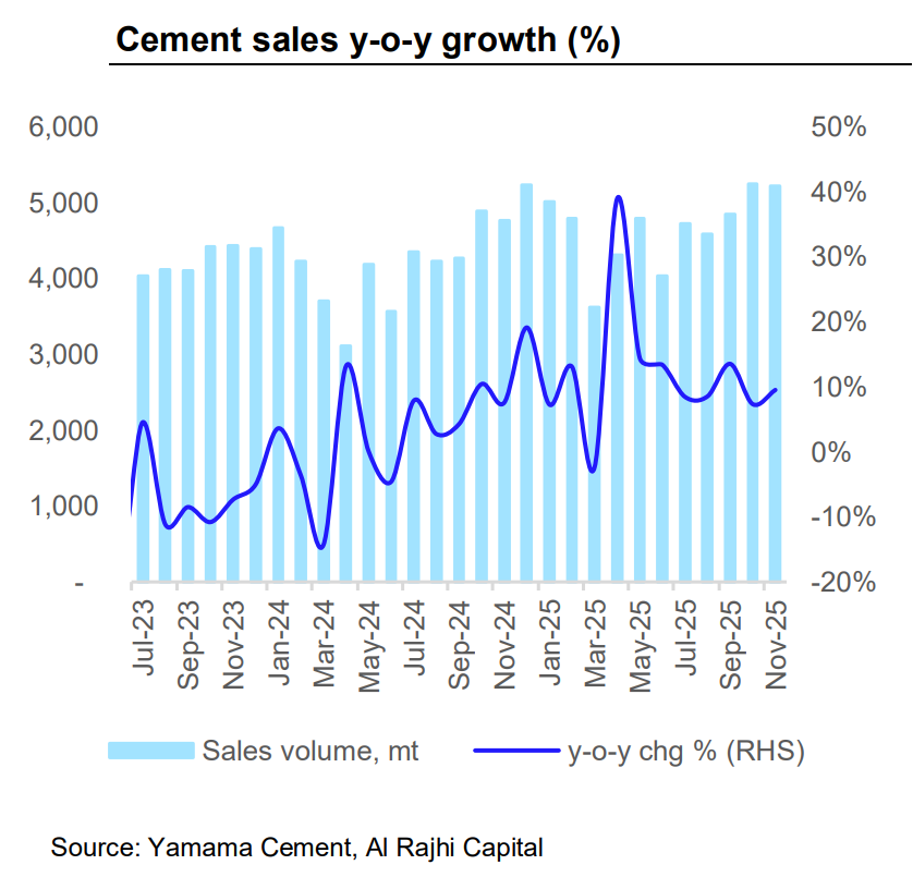 ارتفعت مبيعات الأسمنت في نوفمبر 2025 بنسبة 9.5% على أساس سنوي (بانخفاض 0.5% على أساس شهري) لتصل إلى 5.21 مليون طن، بحسب ما ذكرت شركة الراجحي المالية في تقريرها الشهري عن سوق الأسمنت