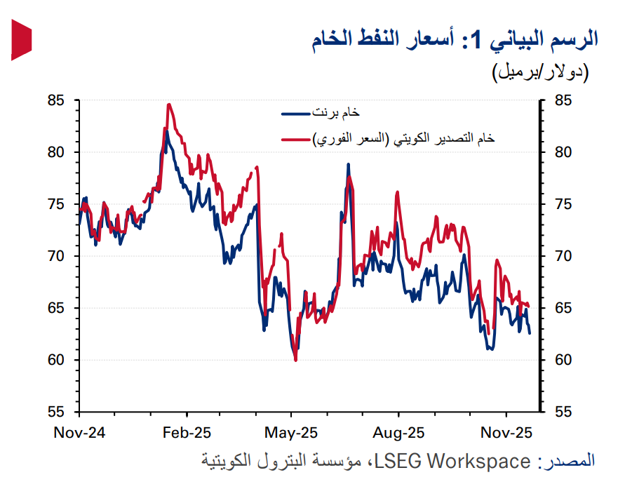 ولفت "الكويت الوطني" إلى أن منظمة الأوبك+ م أكدت مؤخراً قرارها بتعليق زيادات الإنتاج في الربع الأول من عام 2026 لمواجهة ضعف الطلب الموسمي والحد من تراكم المخزونات. ورجح "الكويت الوطني" أن يبلغ متوسط أسعار النفط مستويات منتصف الستين دولاراً، مع تزايد المخاطر نحو الاتجاه الهبوطي. وذلك في حالة غياب أي اضطرابات جيوسياسية أو عقوبات تؤثر على تدفقات النفط، أو نمو اقتصادي عالمي يفوق التوقعات.