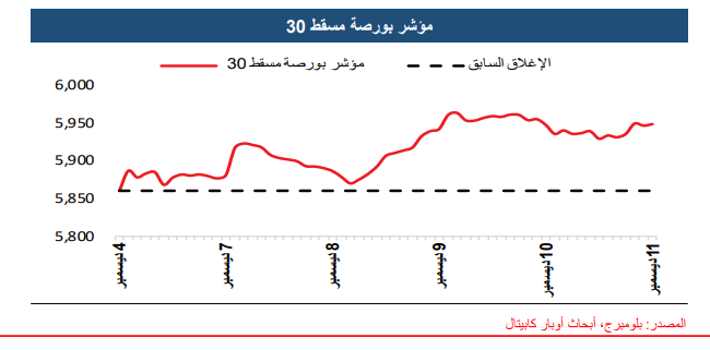 ارتفع مؤشر بورصة مسقط بنسبة %1.5 (88.53 نقطة) خلال الأسبوع المنتهي في 11 ديسمبر 2025، ليغلق عند 5,949.33 نقطة. في المقابل كل المؤشرات صعدت بلا استثناء.