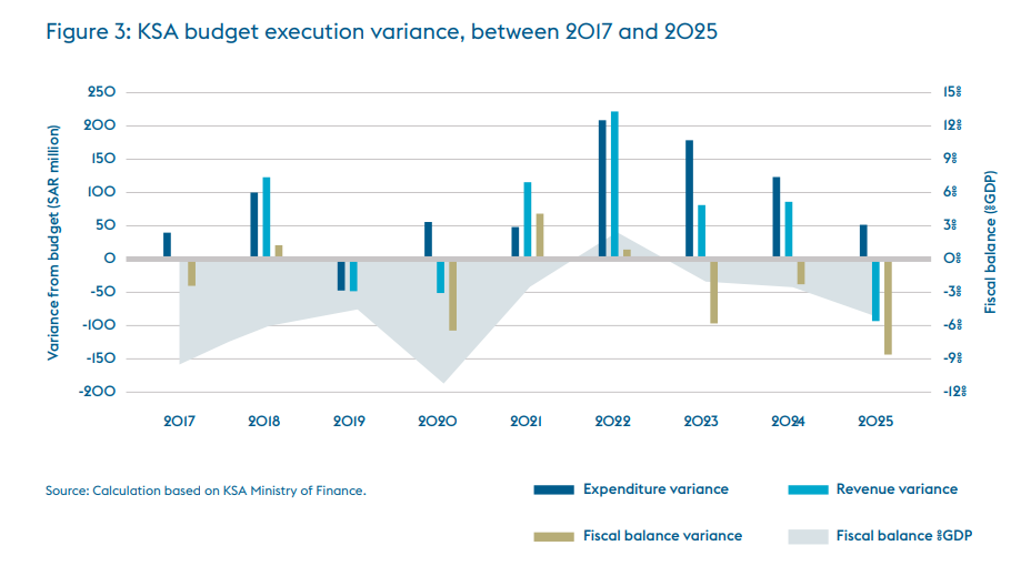 وتتوقع ميزانية 2026 إنفاقًا بقيمة 1.3 تريليون ريال سعودي وإيرادات بنحو 1.15 تريليون ريال سعودي، مما ينتج عنه عجز مالي بنسبة 3.3% من الناتج المحلي الإجمالي. ورغم أن الإنفاق أقل بنسبة 2% فقط من الإنفاق الفعلي في عام 2025، إلا أنه لا يزال مرتفعًا ومتزايدًا وفقًا للمعايير التاريخية، مدعومًا بأسس اقتصادية كلية ومالية قوية، بحسب ما ذكر التقرير.