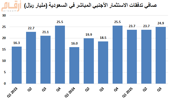 ارتفاع صافي تدفقات الاستثمار الأجنبي المباشر إلى 24.9 مليار ريال (+35%) في الربع الثالث 2025