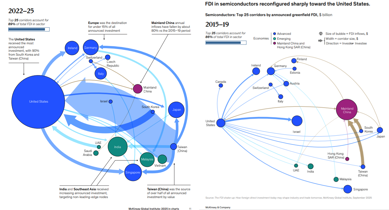 وفيما يخص الاستثمارات الأجنبية المباشرة أشار التقرير إلى وجود أنماط جديدة تبرهن على تحول جذري، وتوقع أن يُساهم الاستثمار الأجنبي المباشر في تشكيل قطاع التصنيع المتقدم، بما في ذلك أشباه الموصلات والمركبات الكهربائية والبطاريات، إلى جانب قطاعي الاتصالات والبرمجيات (وخاصةً البنية التحتية للذكاء الاصطناعي)، والموارد التي تدعمها.