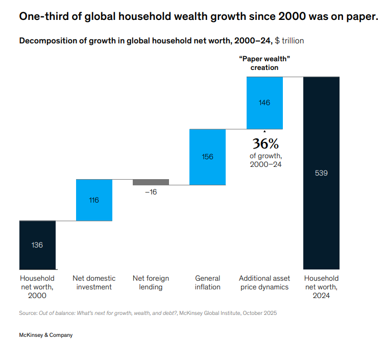 وأوضح تقرير ماكينزي أن إجمالي ثروة العالم بلغ أعلى مستوياته على الإطلاق مع دخول عام 2025، مشيرة إلى أن جزء كبير من هذا النمو من ارتفاع أسعار الأصول، ممولًا بتزايد الديون، بدلًا من المدخرات والاستثمارات الجديدة.