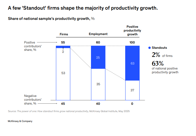 كما تناول التقرير تأثير زيادة الإنتاجية في الشركات على الاقتصاد بأكمله، مشيراً إلى أن غالبية نمو الإنتاجية على شكل طفرات قوية بدلاً من التغيير التدريجي المنتظم، وذلك من خلال تحركات استراتيجية جريئة، ونمو الإيرادات، وتغييرات في محفظة الأعمال، أكثر من مجرد تحسين الكفاءة.