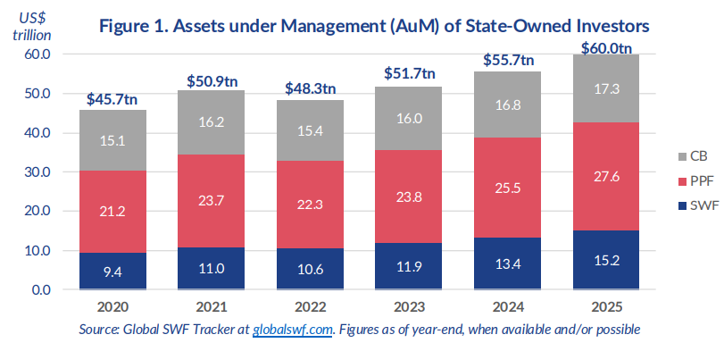 وأوضح التقرير أن الأصول المدارة من قبل صناديق الثروة وصناديق التقاعد إلى جانب البنوك المركزية بلغت رقما قياسيا وصل إلى 60 تريليون دولار خلال 2025، وشكلت صناديق الثروة السيادية ثلثي الأموال المستثمرة في الولايات المتحدة خلال العام.
