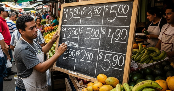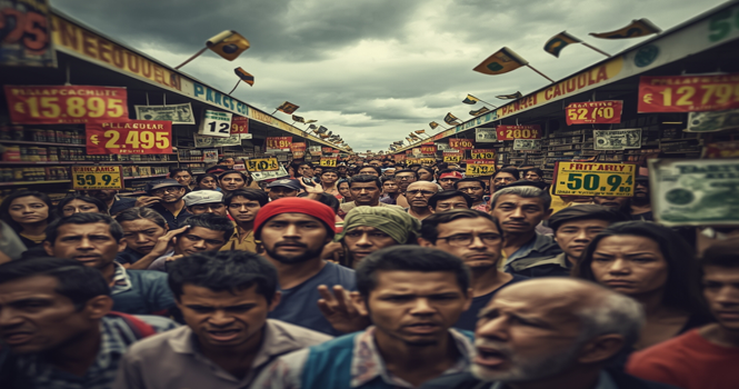 في صباح اليوم، تتوجه إلى المتجر في كاراكاس لتشتري الاحتياجات الأساسية لأطفالك، وتتساءل عن الأسعار لتجد أنها تتغير كل حين – على غرار الأسهم في البورصة - ولكن ليس من خلال شاشة إلكترونية بل عبر سبورة أو لوح تقليدي يقوم البائع بتعديله بصورة مستمرة، حتى أن ثمن طبق البيض (30 بيضة) أصبح 6.40 دولار، في حين يحصل العامل البسيط على أجر لا يتجاوز 60 سنتًا شهريًا.