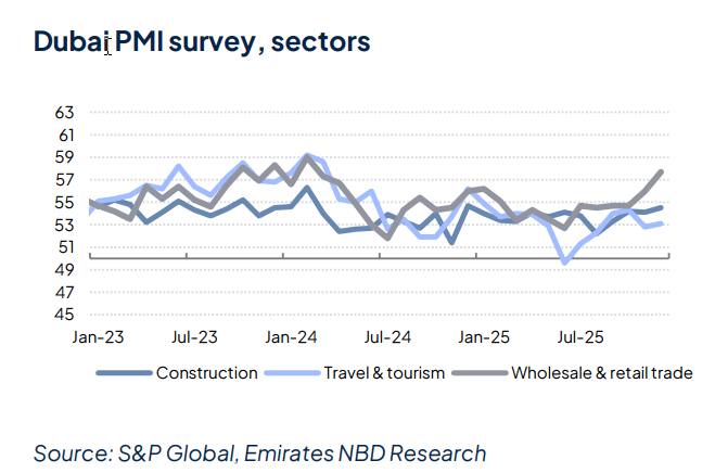 وشهد مؤشر مديري المشتريات لإمارة دبي انخفاضًا طفيفًا في ديسمبر، حيث تراجع إلى 54.3 نقطة، مقارنةً بـ 54.5 نقطة في نوفمبر. ارتفع المؤشر بعد الانخفاض الذي شهده منتصف العام، ليختتم العام بزخم قوي مع اقتراب عام 2026، حيث بلغ متوسط الربع الأخير 54.4، مقارنةً بمتوسط 53.8 لعام 2025، بانخفاض عن 55.1 في عام 2024.