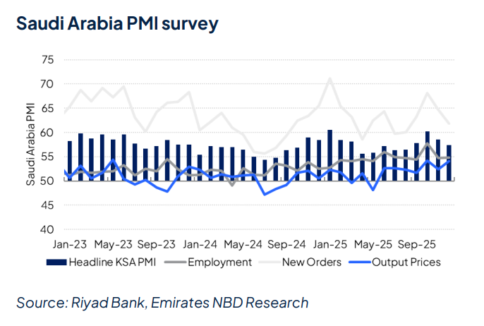 تراجع مؤشر مديري المشتريات الصادر عن بنك الرياض في المملكة العربية السعودية إلى 57.4 نقطة في ديسمبر، مقارنةً بـ 58.5 نقطة في الشهر السابق. ويُعد هذا أبطأ معدل نمو رئيسي خلال أربعة أشهر، ولكنه لا يزال مؤشراً على نمو سريع للقطاع الخاص غير النفطي، حيث حافظ الاقتصاد بوضوح على زخم إيجابي مع اقتراب عام 2026، وبلغ متوسط المؤشر 57.7 نقطة في عام 2025، مرتفعاً من 56.5 نقطة في عام 2024، مما ساهم في تقديرنا لنمو الناتج المحلي الإجمالي الحقيقي غير النفطي بنسبة 4.9% العام الماضي.