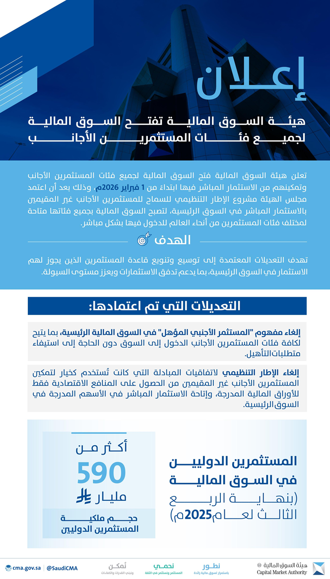 فتح السوق السعودي أمام جميع فئات المستثمرين الأجانب اعتباراً من 01 فبراير 2026