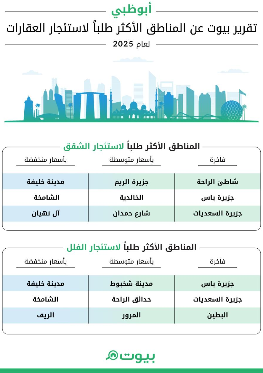 أما في الفئة الفاخرة، فكانت شاطئ الراحة الخيار الأول للشقق وجزيرة ياس للفلل، مع استمرار جزيرة السعديات في استقطاب الطلب عبر مختلف فئات الفخامة. وارتفعت إيجارات الشقق ذات الأسعار المناسبة بين 8% و30%، كما ارتفعت إيجارات الشقق في الفئة المتوسطة حتى 25%، وفي الفئة الفاخرة حتى 32%، خاصة للشقق المكونة من غرفة نوم واحدة في شاطئ الراحة وجزيرة السعديات.