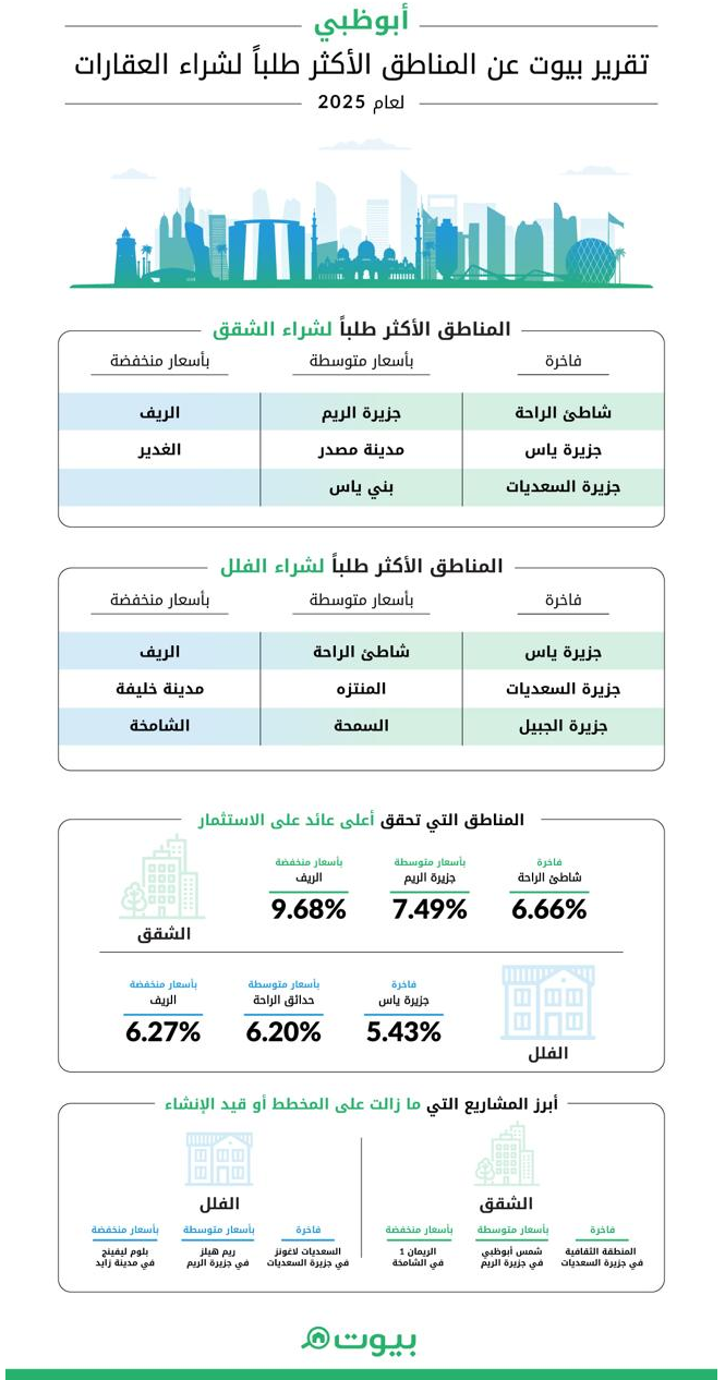 وبخصوص سوق المشاريع على الخارطة، أشار تقرير بيوت إلى استمرار اهتمام المستثمرين بالسوق عبر مختلف الفئات السعرية، ففي فئة الشقق ذات الأسعار المناسبة، تركز الطلب على مشاريع مثل الريمان 1 في الشامخة وبلوم ليفينغ في مدينة زايد، بينما شهدت الفئة المتوسطة اهتماماً بمشاريع شمس أبوظبي في جزيرة الريم وغاردينيا باي في جزيرة ياس، في حين برزت المنطقة الثقافية في السعديات ونوايف بارك فيوز في جزيرة الحديريات ضمن الفئة الفاخرة.