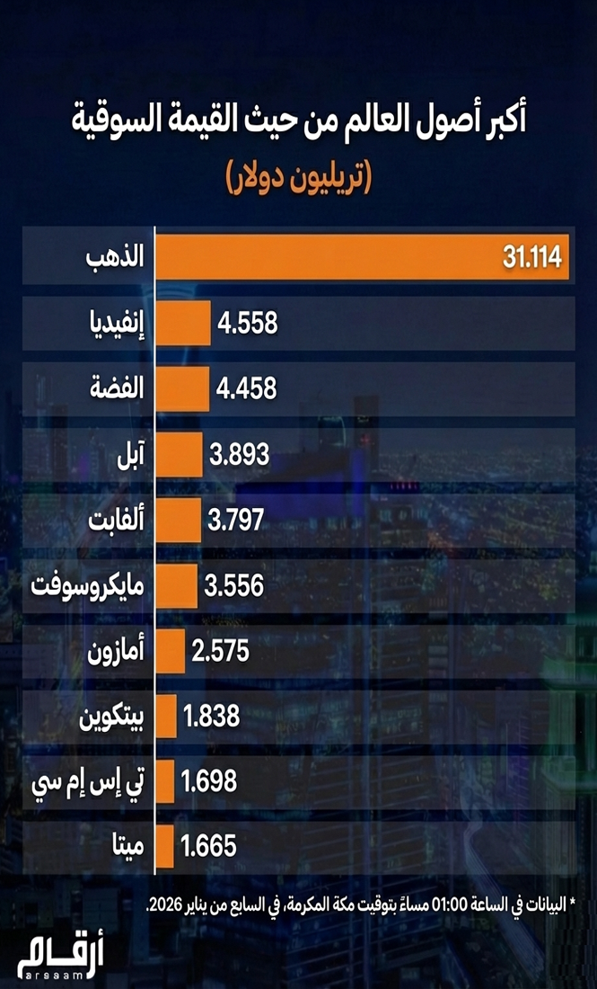 وبذلك، تجاوزت الفضة القيمة السوقية لشركة "إنفيديا"، والبالغة 4.558 تريليون دولار، لتصبح ثاني أكبر أصول العالم قيمة سوقية، قبل أن تتراجع لاحقًا إلى المركز الثالث عقب خسائر جلسة اليوم، بحسب بيانات "كومبانيز ماركت كاب".