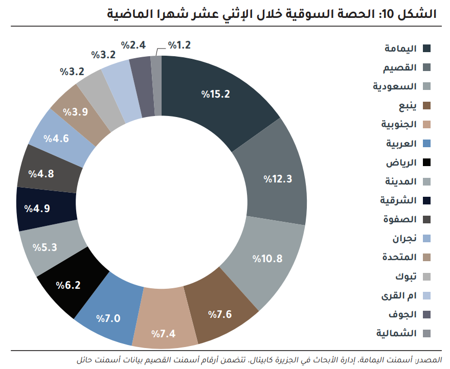 كانت الحصة السوقية الأعلى خلال الاثني عشر شهرا السابقة أسمنت اليمامة بنسبة 15.2% تليها أسمنت القصيم بنسبة 12.3% ثم أسمنت السعودية بحصة سوقية 10%.