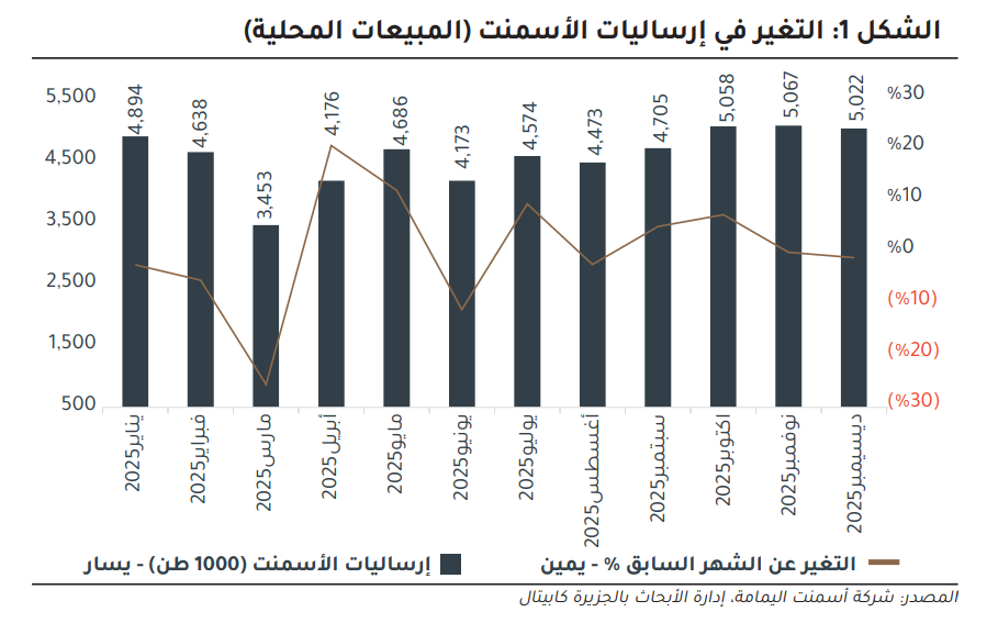 ارتفعت ارساليات الأسمنت المحلية قليلا في ديسمبر 2025 عن الشهر المماثل من العام السابق بنسبة 0.3% إلى 5.02 مليون طن. يعكس ذلك اتجاه الطلب المتصاعد خلال العام 2025. حيث استمر نمو حجم المبيعات المحلية منذ بداية العام، فيما انخفضت قليلا مبيعات الأسمنت المحلية عن الشهر السابق بنسبة 0.9%، بقيادة أسمنت اليمامة (انخفاض 24% أو ما يعادل 197 ألف طن) وأسمنت السعودية (انخفاض 5% أو ما يعادل 28 ألف طن) خلال ديسمبر 2025.