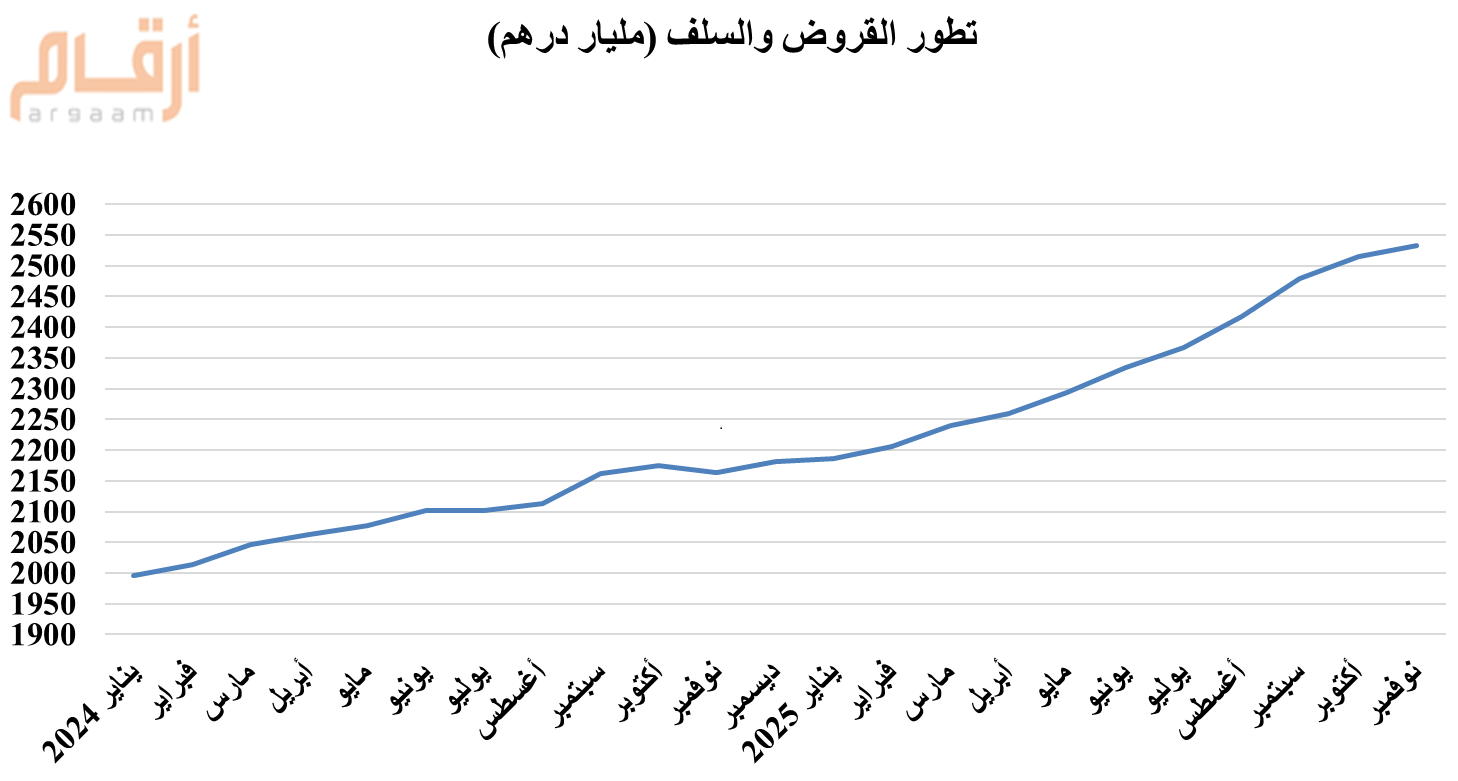 وارتفع إجمالي الائتمان إلى 2532.9 مليار درهم بنهاية نوفمبر الماضي، وبنسبة 17% مقارنة بنفس الفترة من عام 2024، في حين ارتفع بقيمة 17.7 مليار درهم مقارنة بالشهر الذي سبقه.
