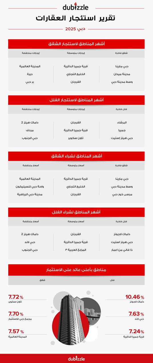 - استمر سوق الإيجارات في دبي بالنمو خلال 2025، مع طلب نشط في مختلف الأحياء، حيث حافظت دبي مارينا على مكانتها للشقق الفاخرة، بينما تصدرت قرية جميرا الدائرية والمدينة العالمية الفئات المتوسطة والمنخفضة. وسجلت المدينة العالمية أعلى زيادة في متوسط الإيجارات لتصل إلى 53 ألف درهم، ضمن الفئة المنخفضة.
