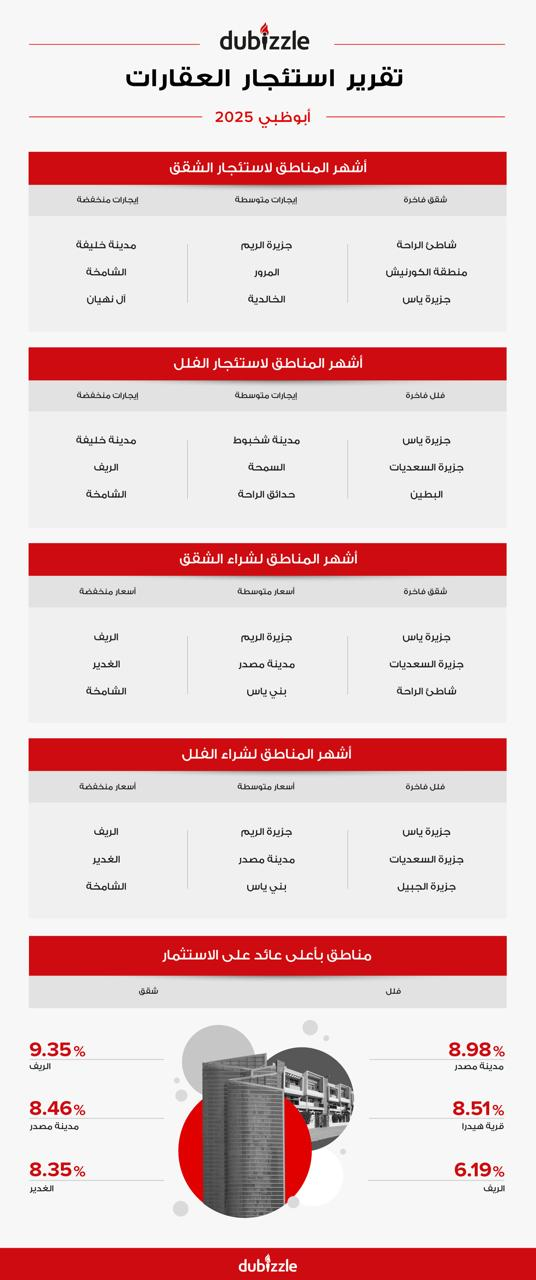 - بالنسبة للفلل الفاخرة، فقد جذبت مجتمعات جزيرة ياس، السعديات والجبيل اهتمام المستثمرين، بينما استقطبت جزيرة الريم، حدائق الراحة والشامخة المستثمرين الباحثين عن فلل متوسطة المستوى، مع وصول متوسط سعر الفلل في جزيرة الريم إلى 608.7 ألف درهم. وبرزت الريف بأعلى عائد استثماري للشقق بنسبة 9.35%، فيما سجلت مدينة مصدر أعلى عائد للفلل بنسبة 8.98%.