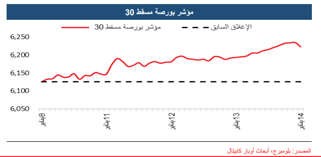 ارتفع مؤشر بورصة مسقط 30 بنسبة 1.60% على أساس أسبوعي، ليغلق عند 6,223.77 نقطة، مسجلاً أعلى مستوى له منذ مايو 2016، وسجلت جميع المؤشرات القطاعية مكاسب خلال الأسبوع المنتهي في 14 يناير 2026.