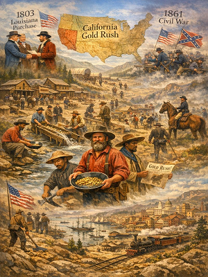 تقع حمّى الذهب في كاليفورنيا بين صفقة شراء لويزيانا عام 1803 والحرب الأهلية الأمريكية عام 1861، ويعدّها كثير من المؤرخين الحدث الأهم في النصف الأول من القرن التاسع عشر، ليس فقط بسبب الثروة التي أُخرجت من باطن الأرض، بل لأن هذا الحدث أعاد رسم الخريطة الديموغرافية والاقتصادية والسياسية للولايات المتحدة.