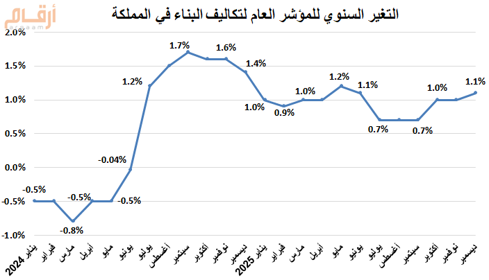 سجل الرقم القياسي لتكاليف البناء في المملكة العربية السعودية ارتفاعاً خلال شهر ديسمبر 2025 بنسبة 1.1% مقارنة بنفس الفترة من عام 2024.