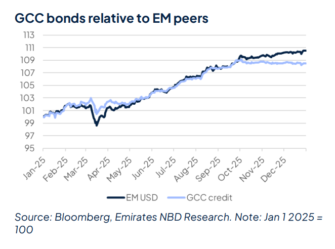 قال بنك الإمارات دبي الوطني إن أسواق الائتمان في الشرق الأوسط حافظت على استقرارها النسبي خلال الأسبوع المنتهي في 23 يناير 2026، رغم الانخفاض الحاد في أسواق السندات العالمية، الناتج عن خسائر سوق السندات الحكومية اليابانية، مشيرًا إلى أن تأثير هذه التطورات على المنطقة ظل محدودًا.