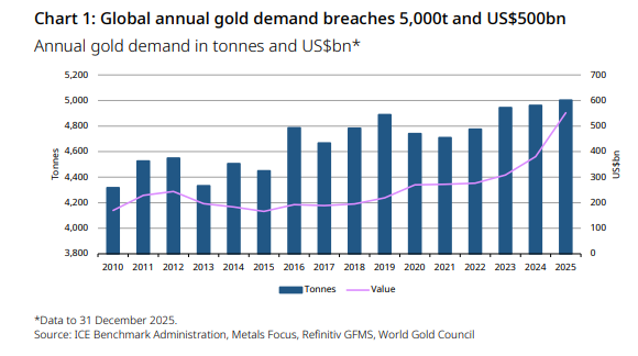 كشف مجلس الذهب العالمي في تقريره الأخير عن "اتجاهات الطلب على الذهب" أن عام 2025 كان عاماً استثنائياً بامتياز، حيث تجاوز إجمالي الطلب العالمي على الذهب - بما في ذلك الأسواق خارج البورصة (OTC) - حاجز 5000 طن لأول مرة في التاريخ. واقترن هذا الحجم القياسي برحلة صعود غير مسبوقة لأسعار المعدن الأصفر، مما دفع القيمة الإجمالية السنوية للطلب إلى مستوى تاريخي بلغ 555 مليار دولار أمريكي، بزيادة قدرها 45% مقارنة بالعام السابق.