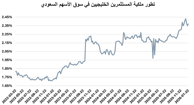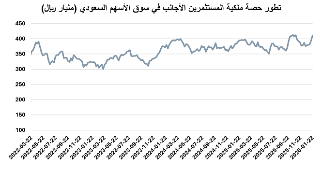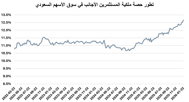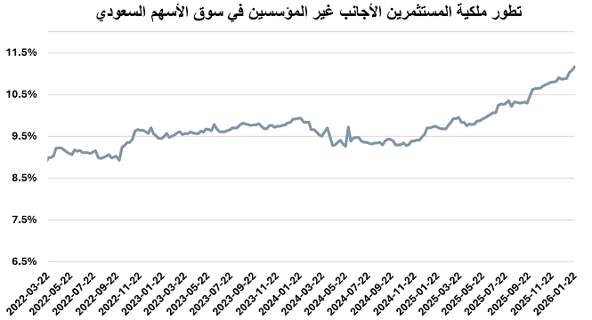 ارتفعت استثمارات الأجانب غير المؤسسين بالسوق السعودي خلال الأسبوع المنتهي في 22 يناير 2026، من 11.07% إلى 11.16% من إجمالي السوق مقارنة بنهاية الأسبوع الذي سبقه، لتبلغ قيمة ملكيتهم بدون أرامكو السعودية 362.3 مليار ريال.