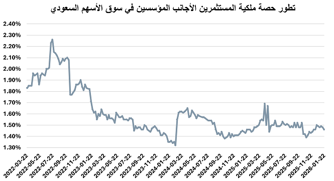 وحسب حسابات أرقام يمثل الملاك الأجانب المؤسسون بدون أرامكو ما نسبته 1.50% من إجمالي ملكية الأجانب في السوق خلال الأسبوع المنتهي في 22 يناير 2026 ما يعادل 48.6 مليار ريال.