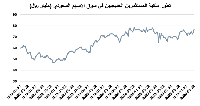 وبخصوص ملكية المستثمرين الخليجيين في تاسي، فقد ارتفعت خلال الأسبوع المنتهي في 22 يناير من 2.35% إلى 2.37%، من إجمالي القيمة السوقية للأسهم المدرجة بدون أرامكو، لتصل قيمة ملكيتهم إلى 77.02 مليار ريال.