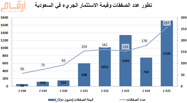وواصلت المملكة العربية السعودية قيادة دول منطقة الشرق الأوسط وشمال إفريقيا من حيث قيمة الاستثمار الجريء، للعام الثالث على التوالي، حيث استحوذت على أكثر من 50% من إجمالي الاستثمار الجريء في عام 2025.