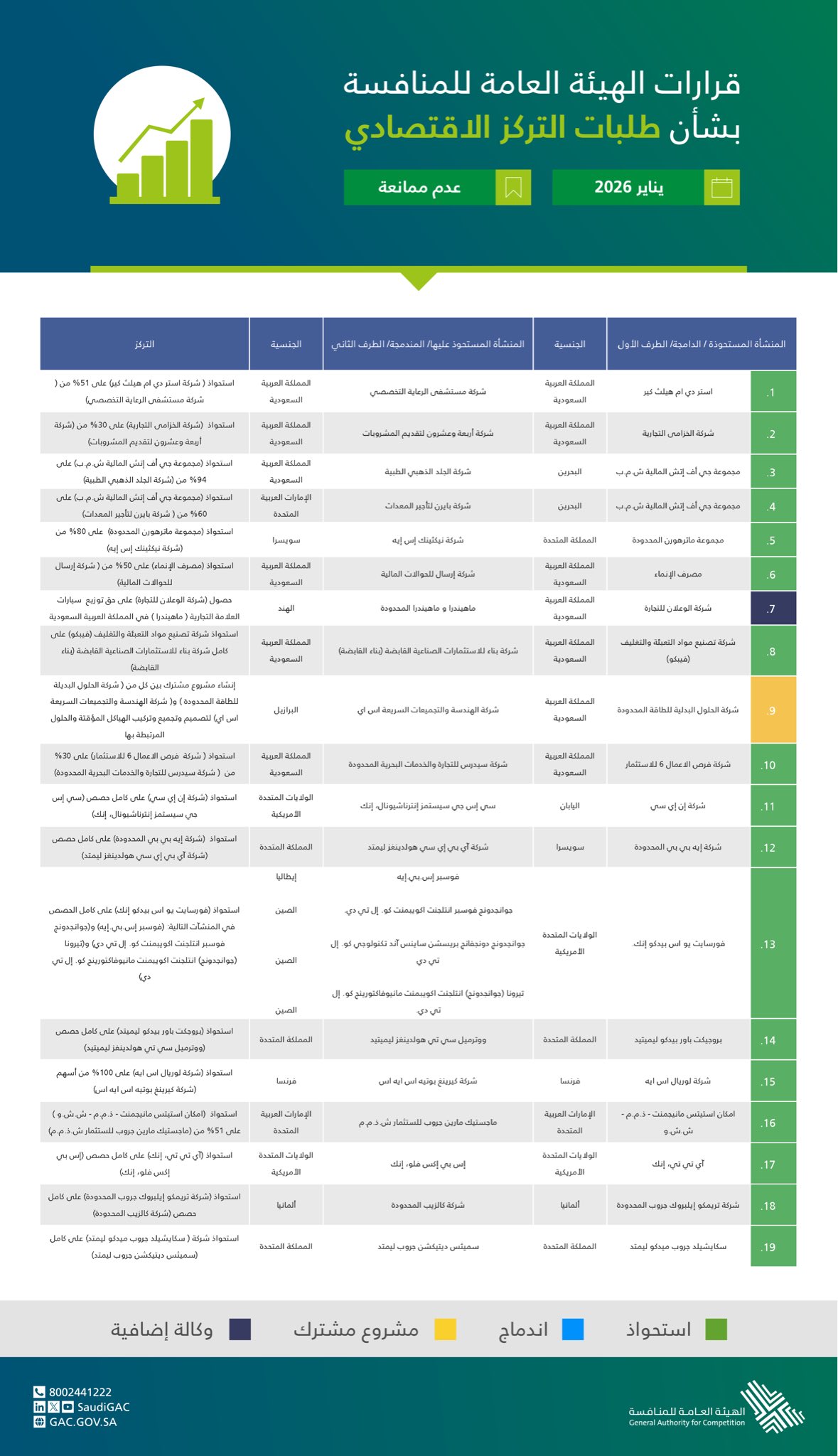 أصدرت الهيئة العامة للمنافسة 19 قراراً بخصوص طلبات التركز الاقتصادي الواردة إليها خلال شهر يناير 2026.