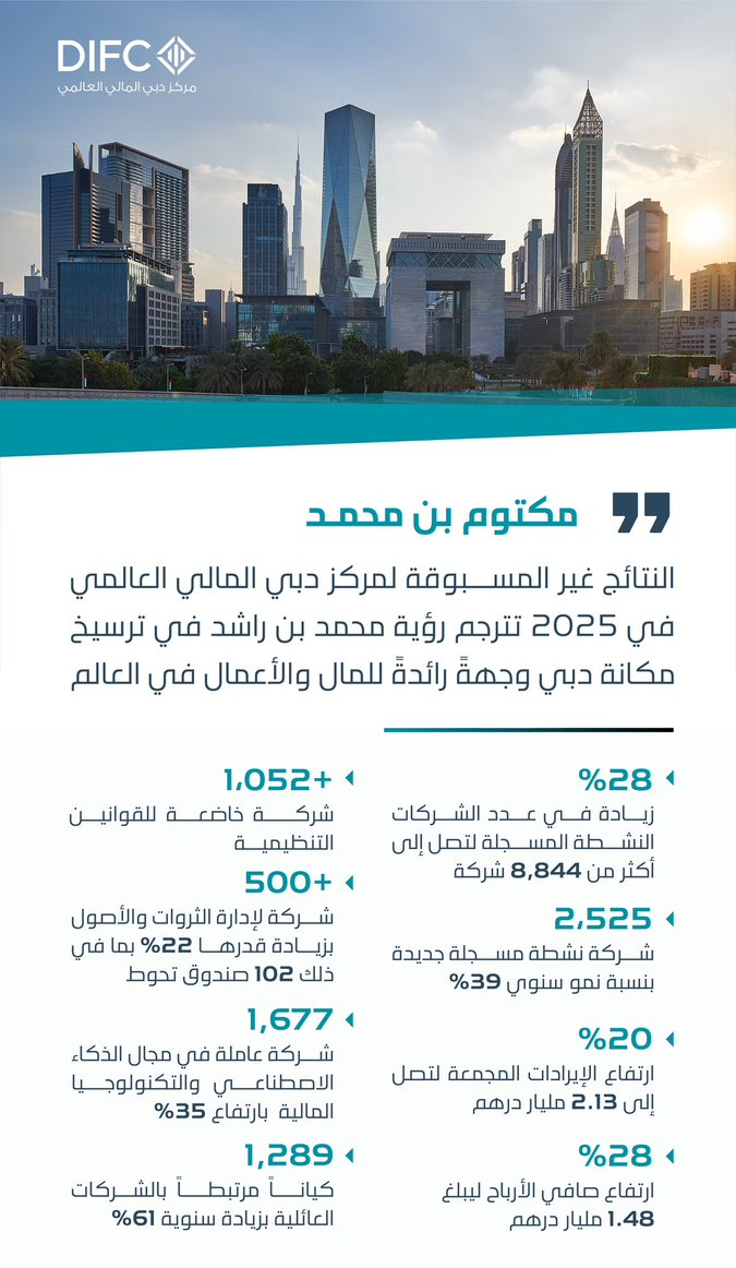 ارتفاع الإيرادات المجمعة لـ مركز دبي المالي العالمي إلى 2.13 مليار درهم (+20%) خلال 2025