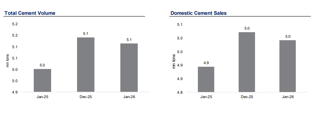 ارتفعت مبيعات الأسمنت الإجمالية لشهر يناير 2026 بنسبة 2.3% على أساس سنوي، مسجلة 5.1 مليون طن بينما انخفضت بنسبة 0.5% مقارنةً بالشهر السابق، بحسب ما ذكر التقرير الشهري لشركة المتحدة للأوراق المالية.