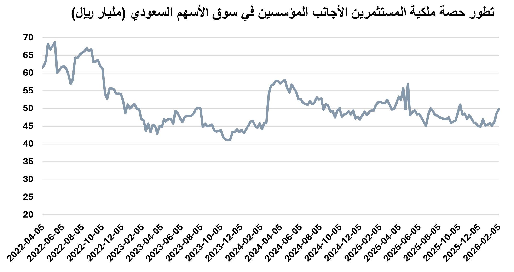وحسب حسابات أرقام يمثل الملاك الأجانب المؤسسون بدون أرامكو ما نسبته 1.49% من إجمالي ملكية الأجانب في السوق خلال الأسبوع المنتهي في 5 فبراير 2026 ما يعادل 48.5 مليار ريال.