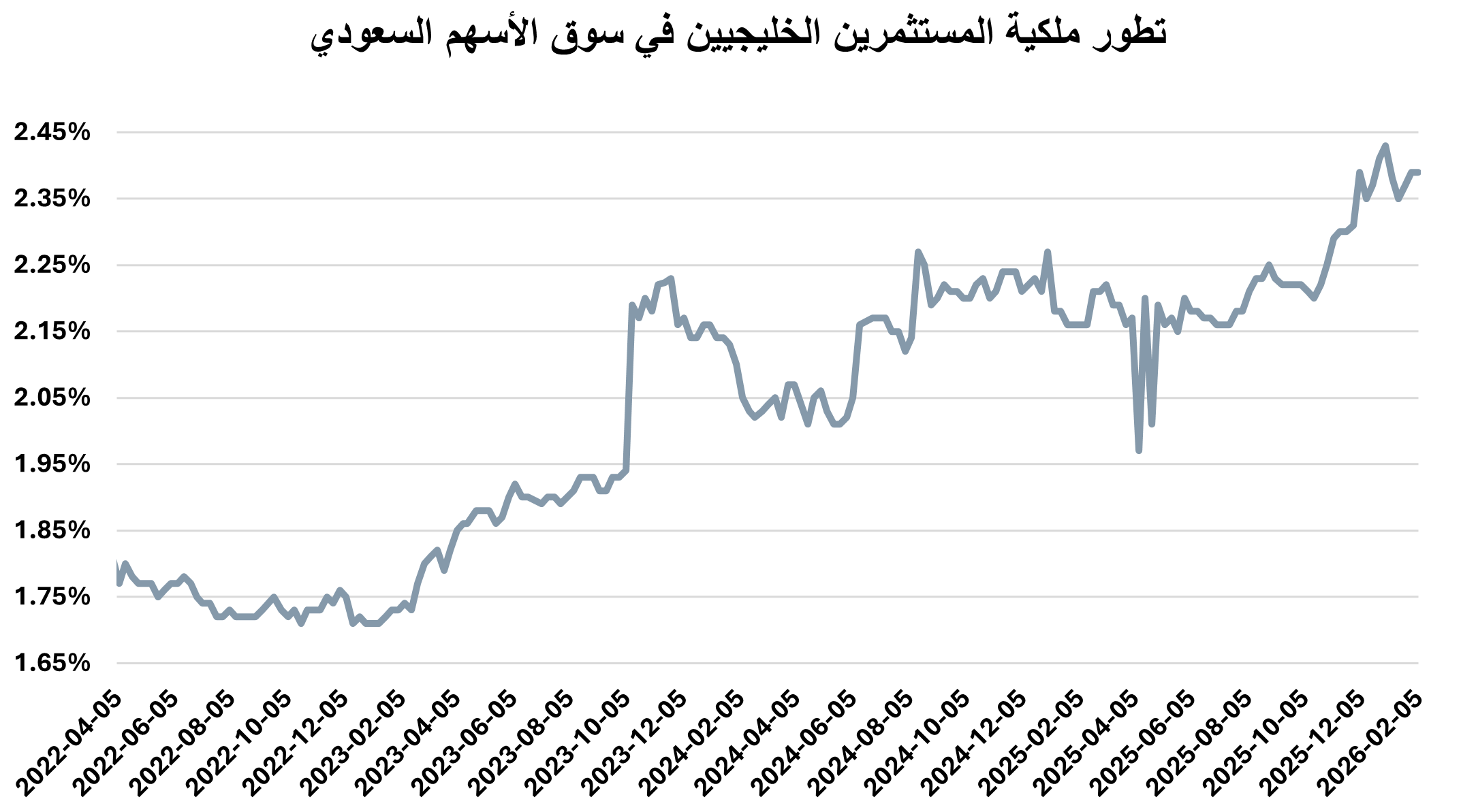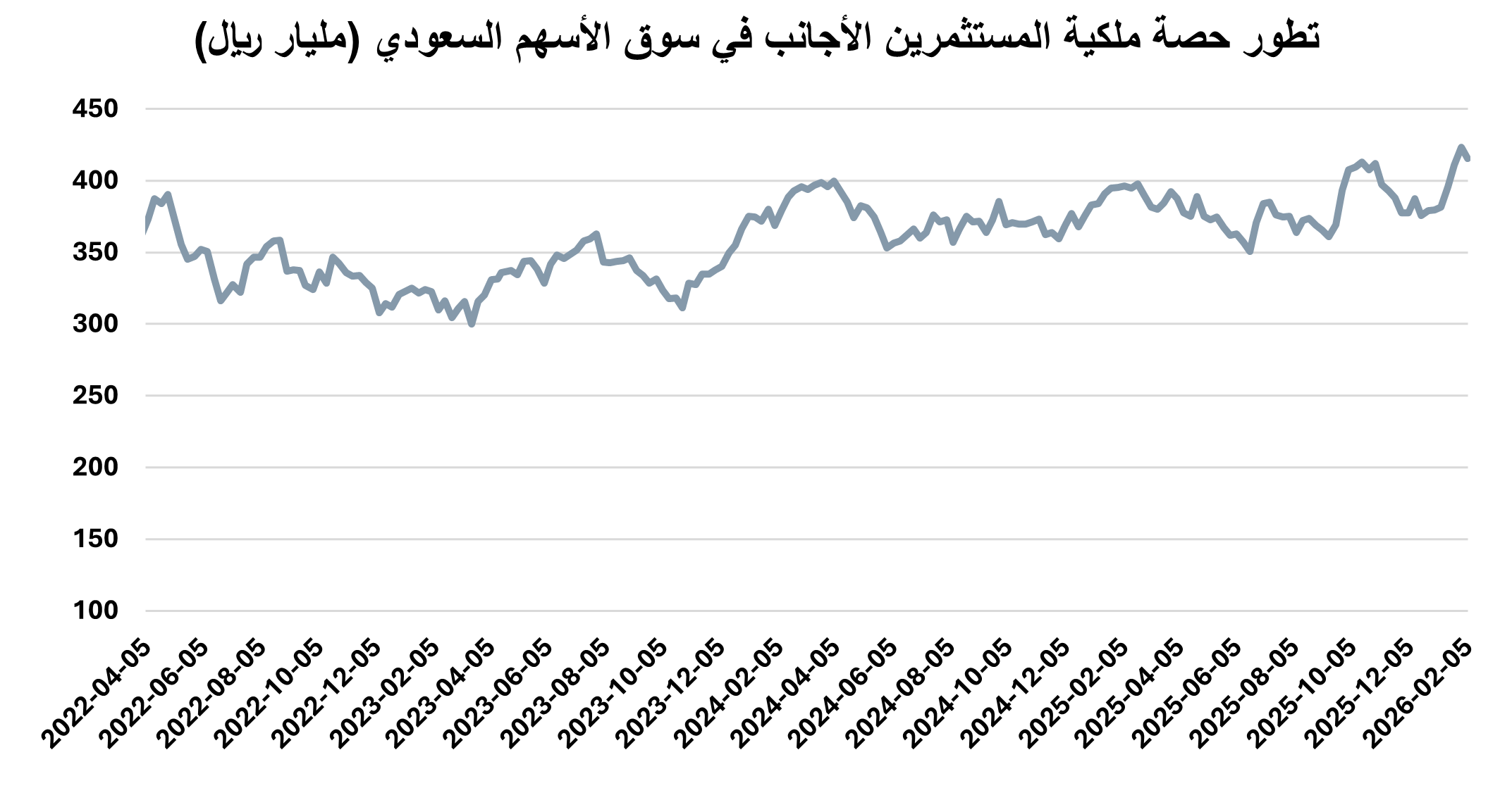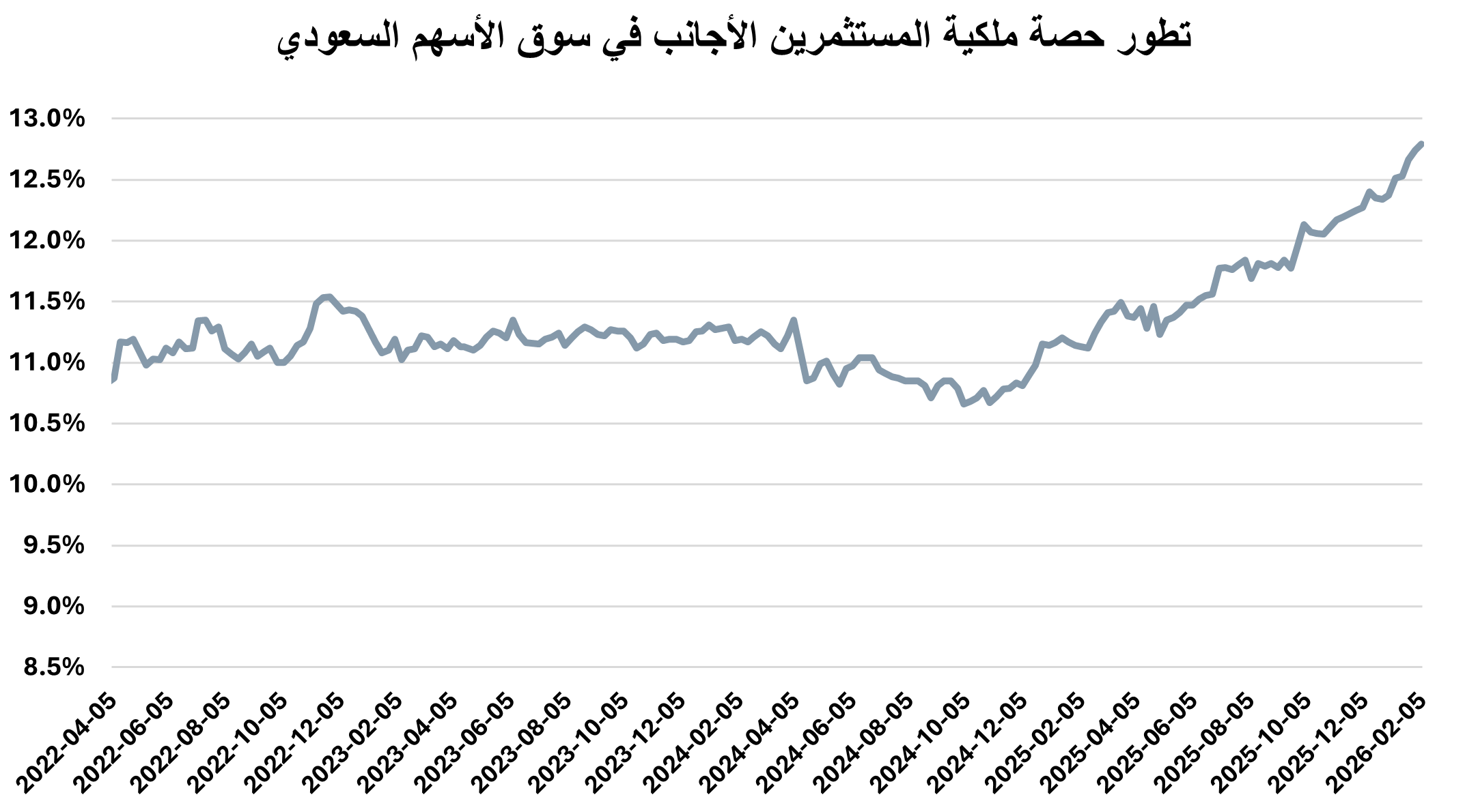 ارتفعت استثمارات الأجانب غير المؤسسين بالسوق السعودي خلال الأسبوع المنتهي في 5 فبراير 2026، من 11.24% إلى 11.30% من إجمالي السوق مقارنة بنهاية الأسبوع الذي سبقه، لتبلغ قيمة ملكيتهم بدون أرامكو السعودية 367.1 مليار ريال.