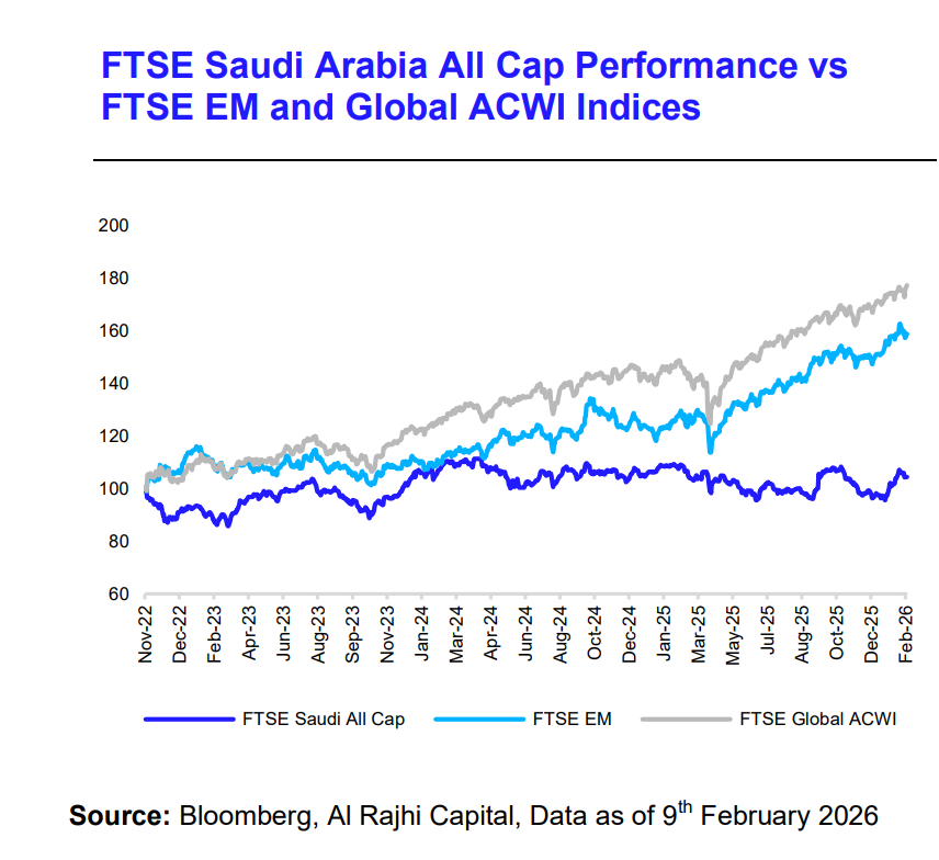 ويضم مؤشر فوتسي السعودي لجميع الشركات حالياً نحو 106 شركات، وتتصدر مكوناته كل من مصرف الراجحي بوزن يقارب 15% وأرامكو السعودية بنحو 10.9%، وفق بيانات حتى 9 فبراير 2026.