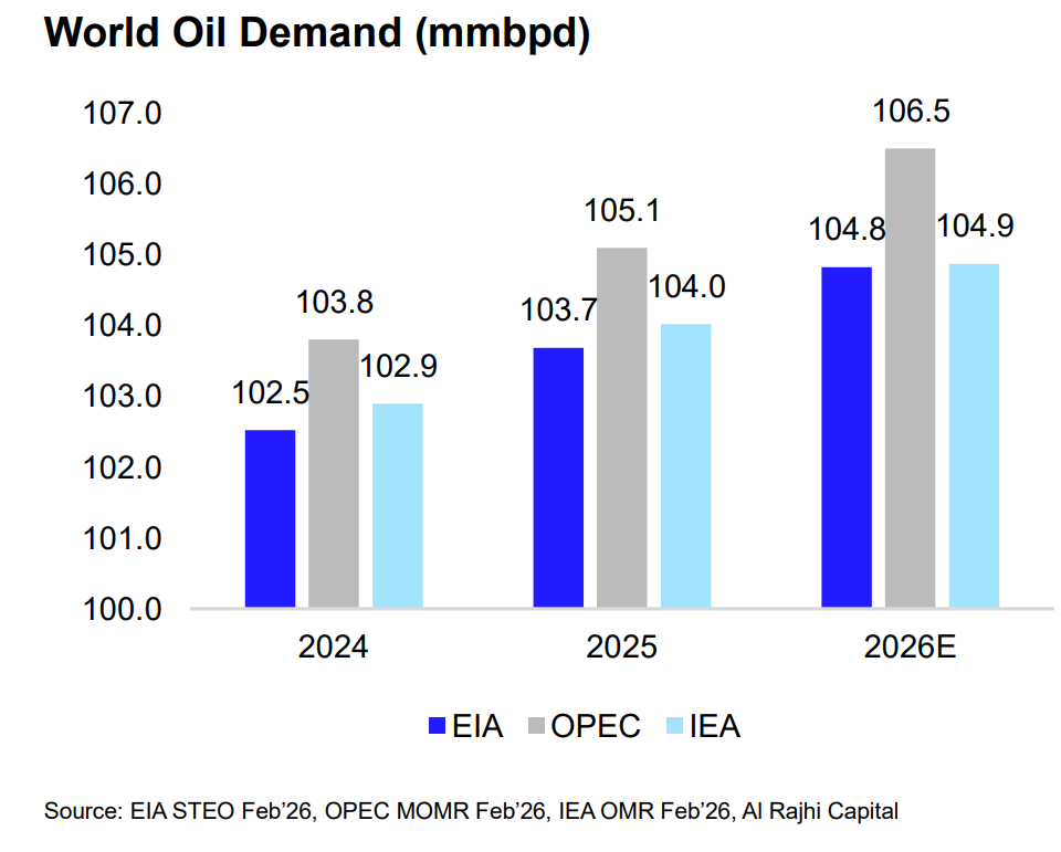 وتوقع التقرير أن أن يبلغ متوسط الطلب العالمي على النفط في عام 2026 نحو 106.5 مليون برميل يوميًا وفقًا لمنظمة أوبك (بنمو سنوي قدره 1.3%)، و104.8 مليون برميل يوميًا وفقًا لإدارة معلومات الطاقة الأمريكية (بنمو سنوي قدره 1.1%).