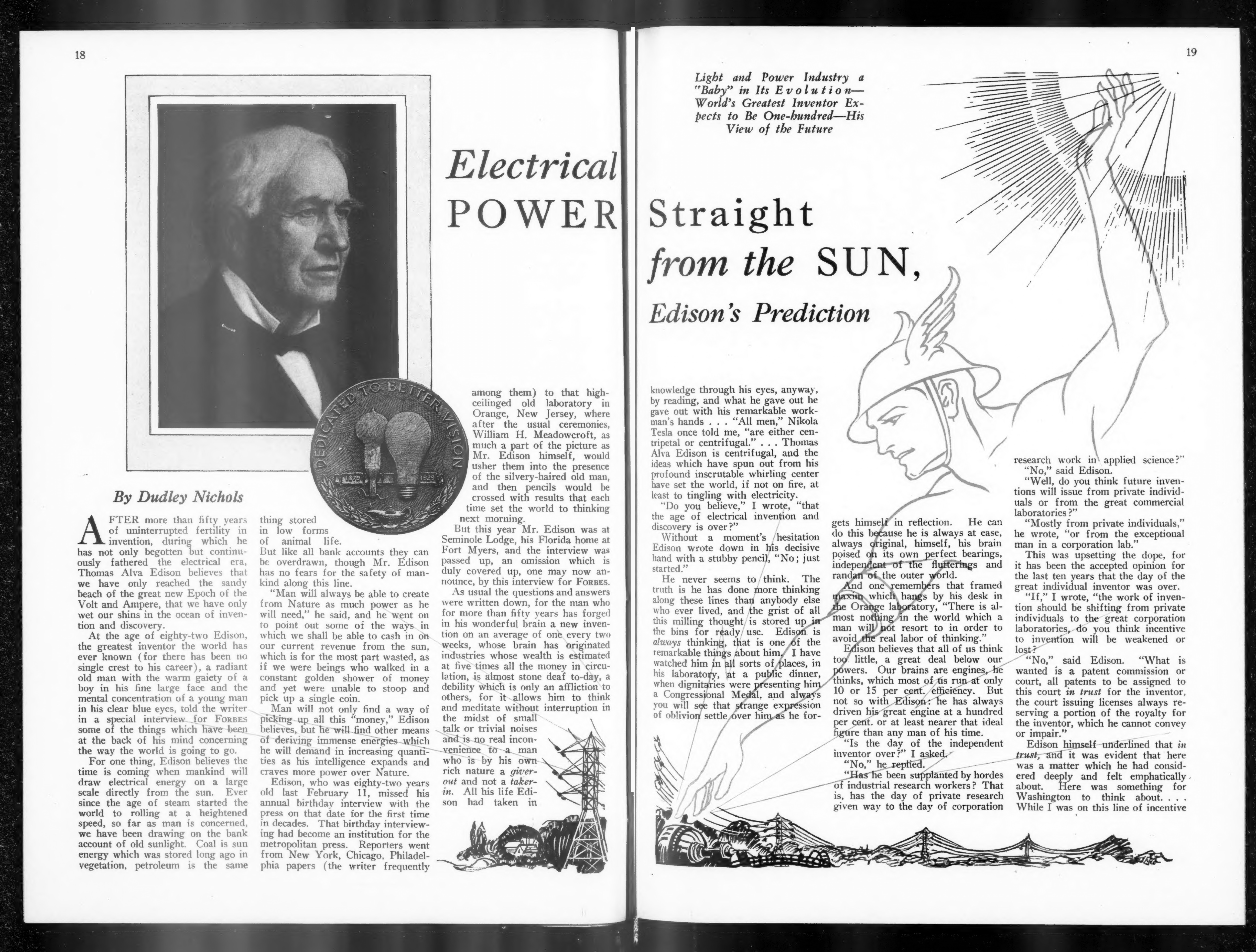 بابتسامة طفل تعلو وجهه الذي خطت فيه سنوات العمل الشاق تجاعيد الحكمة، وعينين زرقاوين تبرقان بتركيز شاب، أعلن "إديسون" لمراسل مجلة "فوربس" أن عصر الكهرباء، رغم كل ما أنجزه، لا يزال "رضيعاً يصرخ" في مهده، وأن ما حققته البشرية وقتها ليس سوى ملامسة بسيطة لشاطئ محيط الاكتشافات العظيم.