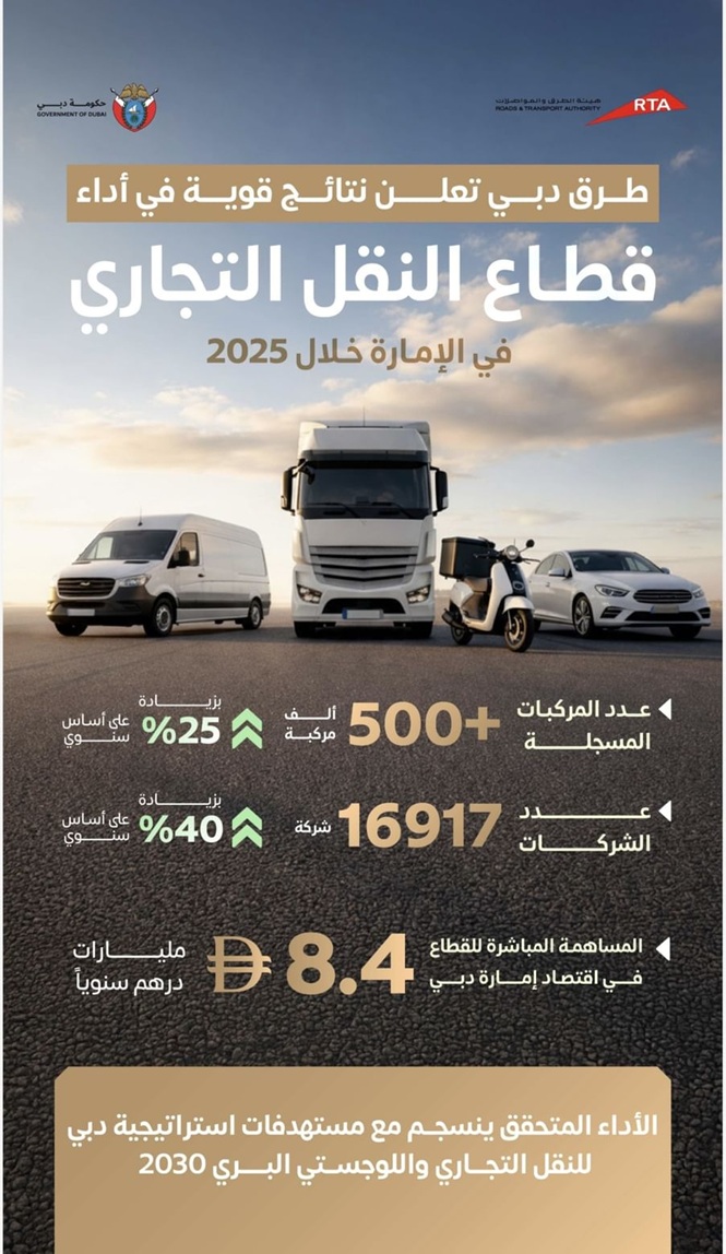 سجل قطاع النقل التجاري في إمارة دبي نمواً في عام 2025، حيث ارتفع عدد شركات النقل التجاري المرخصّة إلى نحو 17 ألف شركة مقارنة بـ 12 ألف شركة في 2024، مسجلة نسبة نمو تجاوزت 40 %.