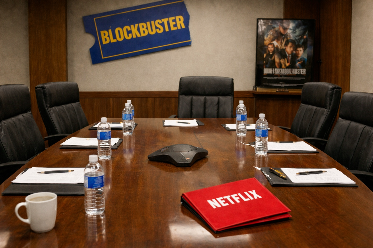 في مقر "بلوكباستر" بدا كل شيء معدًا لإبهار الزائرين بقوة الشركة، بدءًا من المباني وحتى حذاء مديرها التنفيذي الذي كان يفوق سعره تكلفة سيارة "راندلوف"، وبدا "أنتيوكو" واثقًا بنفسه، ورغم هذه الضغوط، شرع "هاستينغز" في الحديث ، مشيرًا إلى المجالات التي يمكن الاستفادة فيها من مكانة "نتفليكس" في السوق وخبراتها.