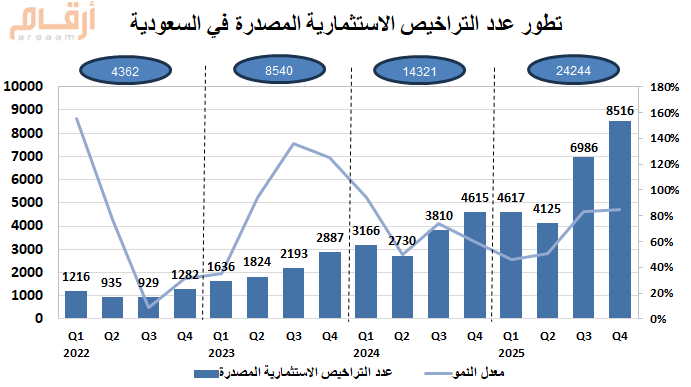 ارتفع عدد الرخص الاستثمارية خلال الربع الرابع 2025 بشكل ملحوظ في عدد من القطاعات، يتقدمها قطاع التشييد الذي قفز 123% إلى 3018 رخصة مقارنة بـ1354 رخصة في الفترة المماثلة من 2024، ما يجعله أكبر القطاعات من حيث العدد.