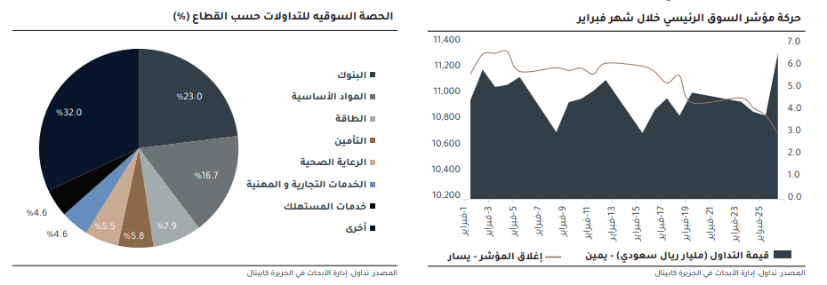 أغلق مؤشر السوق الرئيسي (تاسي) شهر فبراير 2026 عند 10,709 نقطة، بانخفاض 5.91% عن إغلاق الشهر السابق، وبمتوسط قيمة تداول يومي عند 4.6 مليار ريال سعودي. أيضاً، بلغ إجمالي القيمة المتداولة للشهر مبلغ 87.1 مليار ريال سعودي بانخفاض 12.9% عن الشهر السابق حيث بلغ إجمالي القيمة المتداولة في يناير عند 100.0 مليار ريال سعودي.