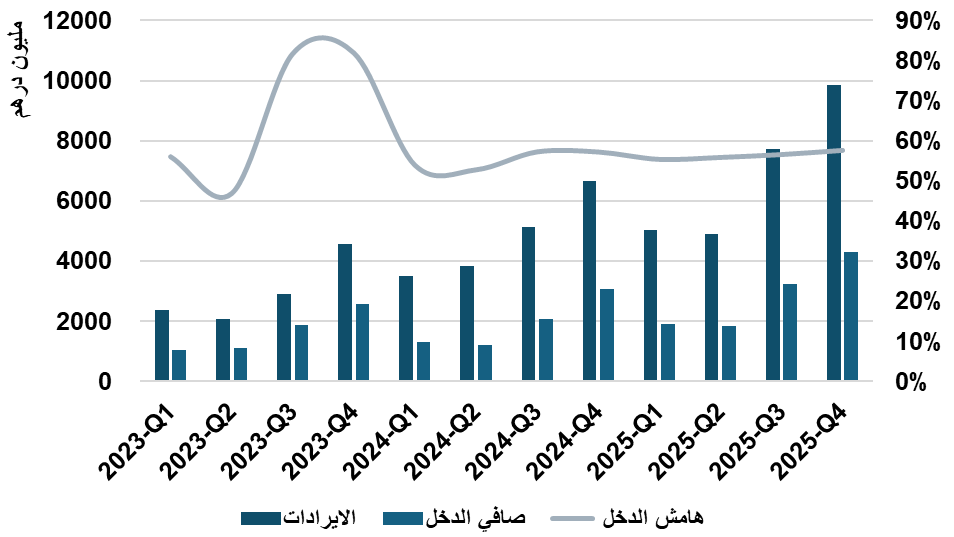 وعلى صعيد نتائج الشركة ارتفعت الأرباح من الحصة في دخل الشركات الشقيقة إلى 461.2 مليون درهم، مقابل 110.4 مليون درهم خلال الربع الرابع 2024، فيما ارتفع كل من الإيرادات الأخرى وإيرادات الودائع لأجل بنسب 79%، و62% على التوالي مقارنة بالربع المقارن من العام الماضي.