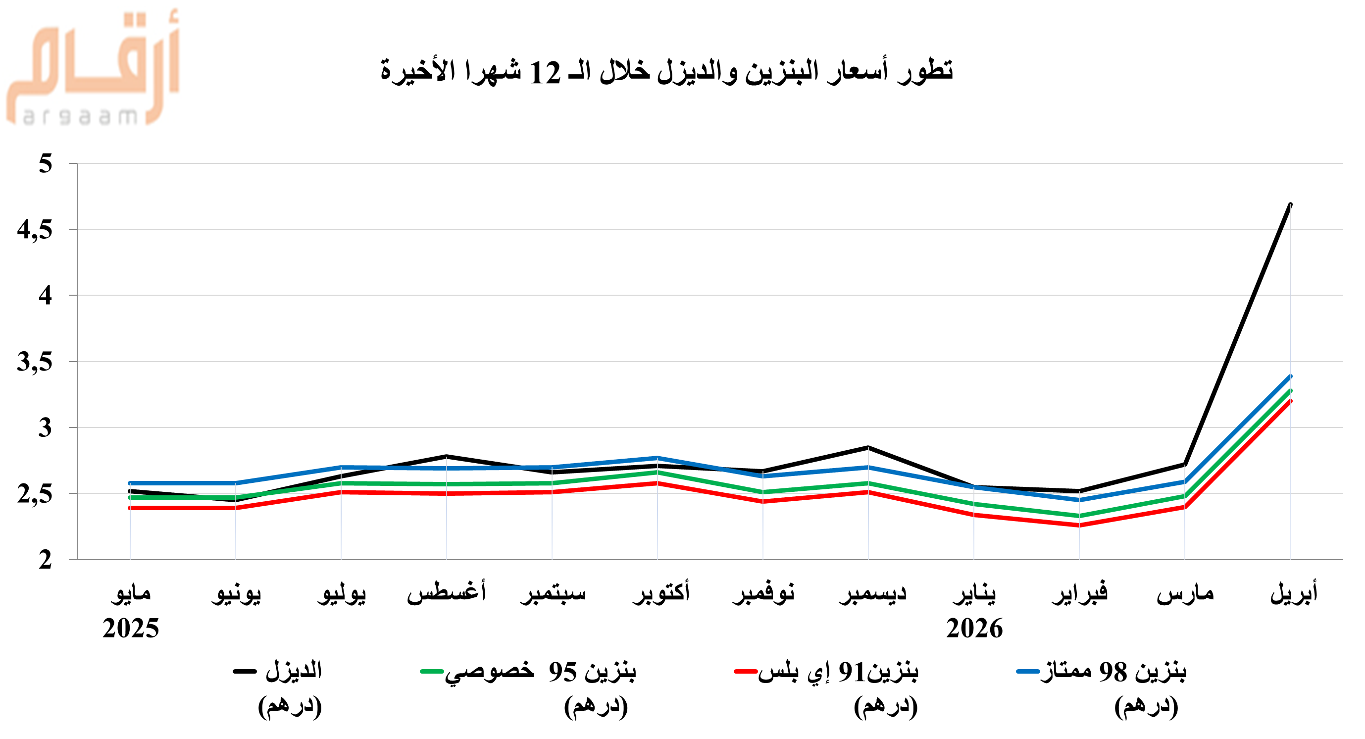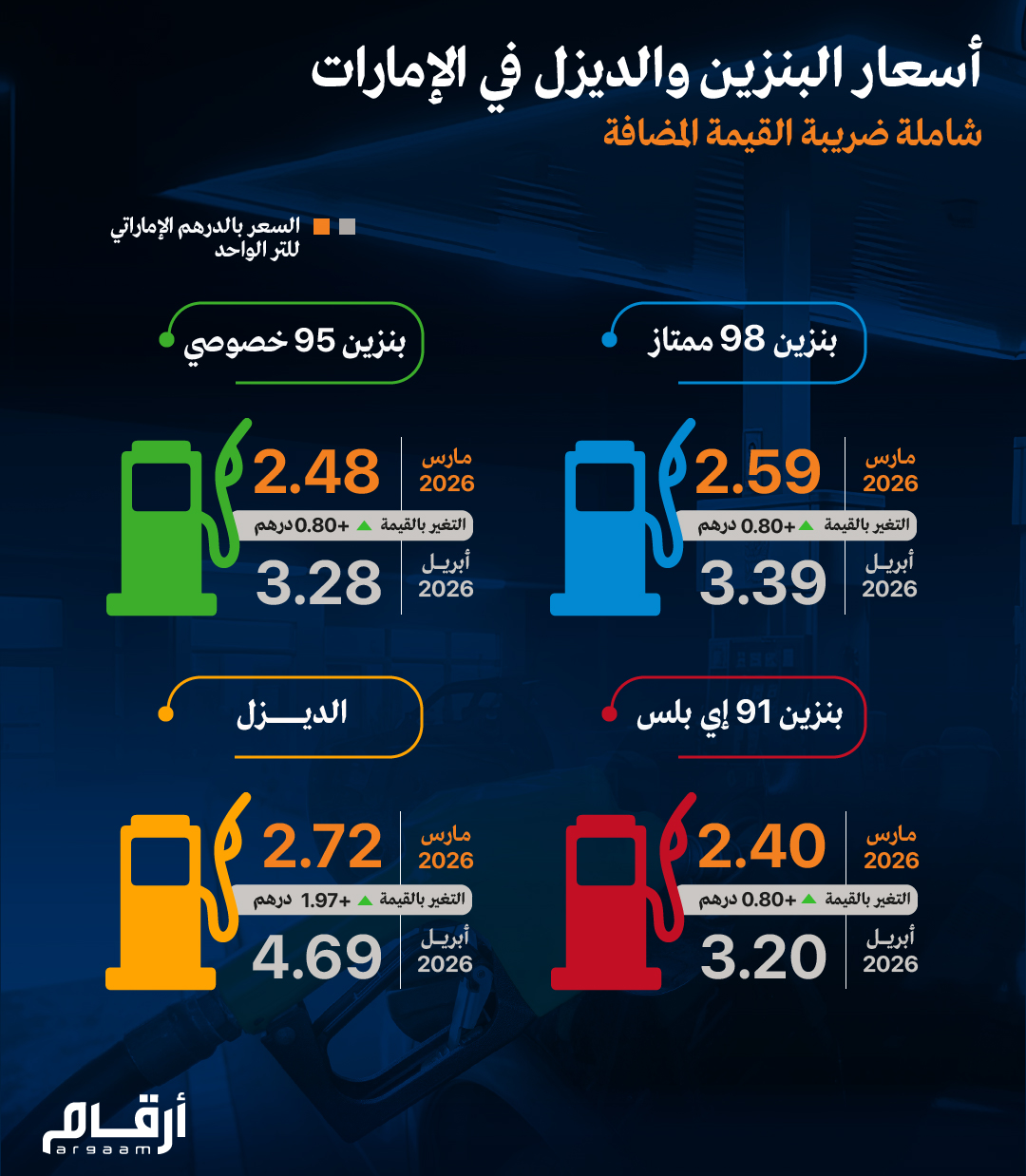 أقرت لجنة متابعة أسعار البنزين والديزل في الإمارات، أسعار البنزين بأنواعه والديزل لشهر أبريل شاملة ضريبة القيمة المضافة (5%)، ويبدأ تطبيق الأسعار اعتباراً من 1 أبريل 2026.