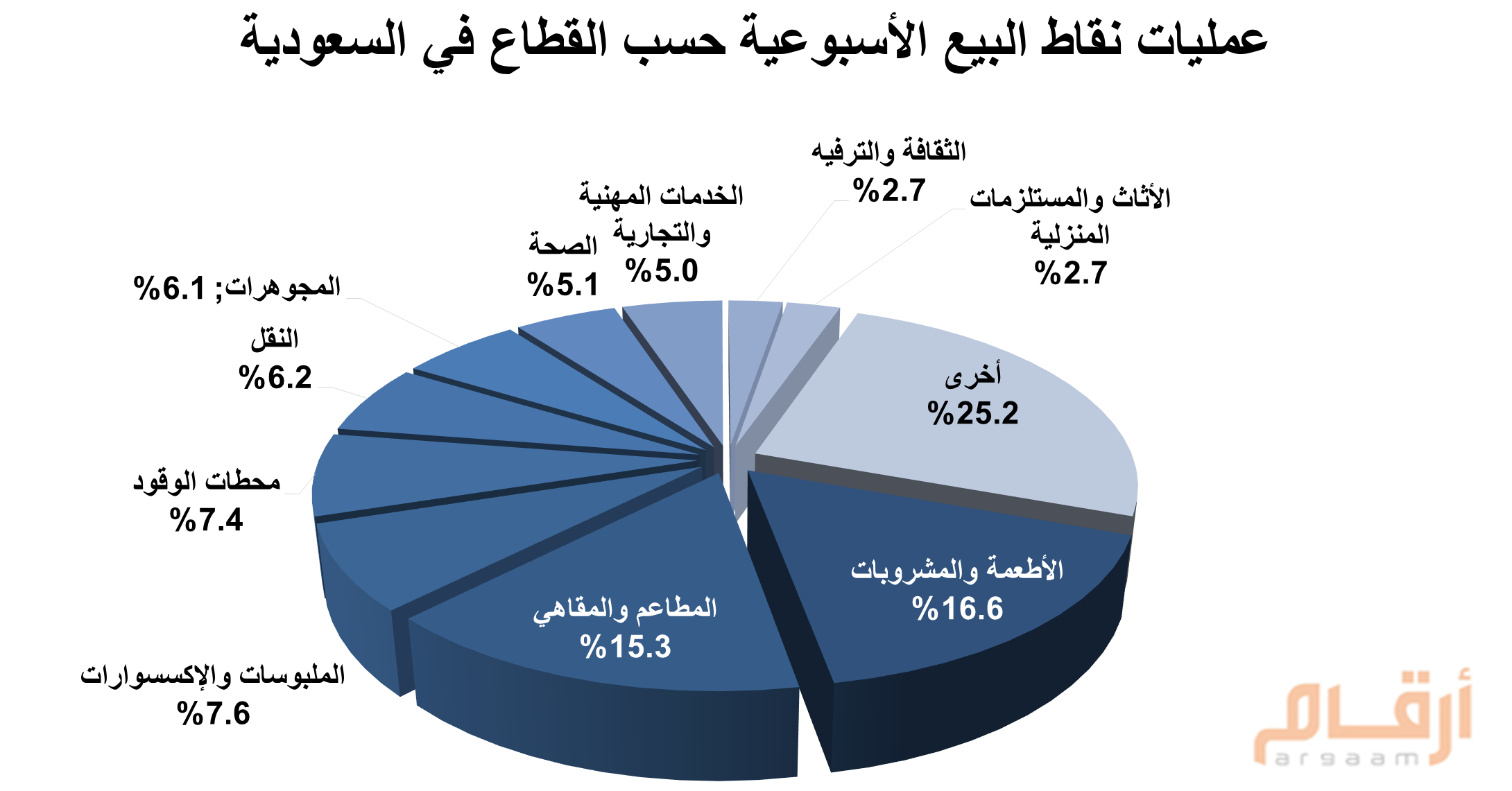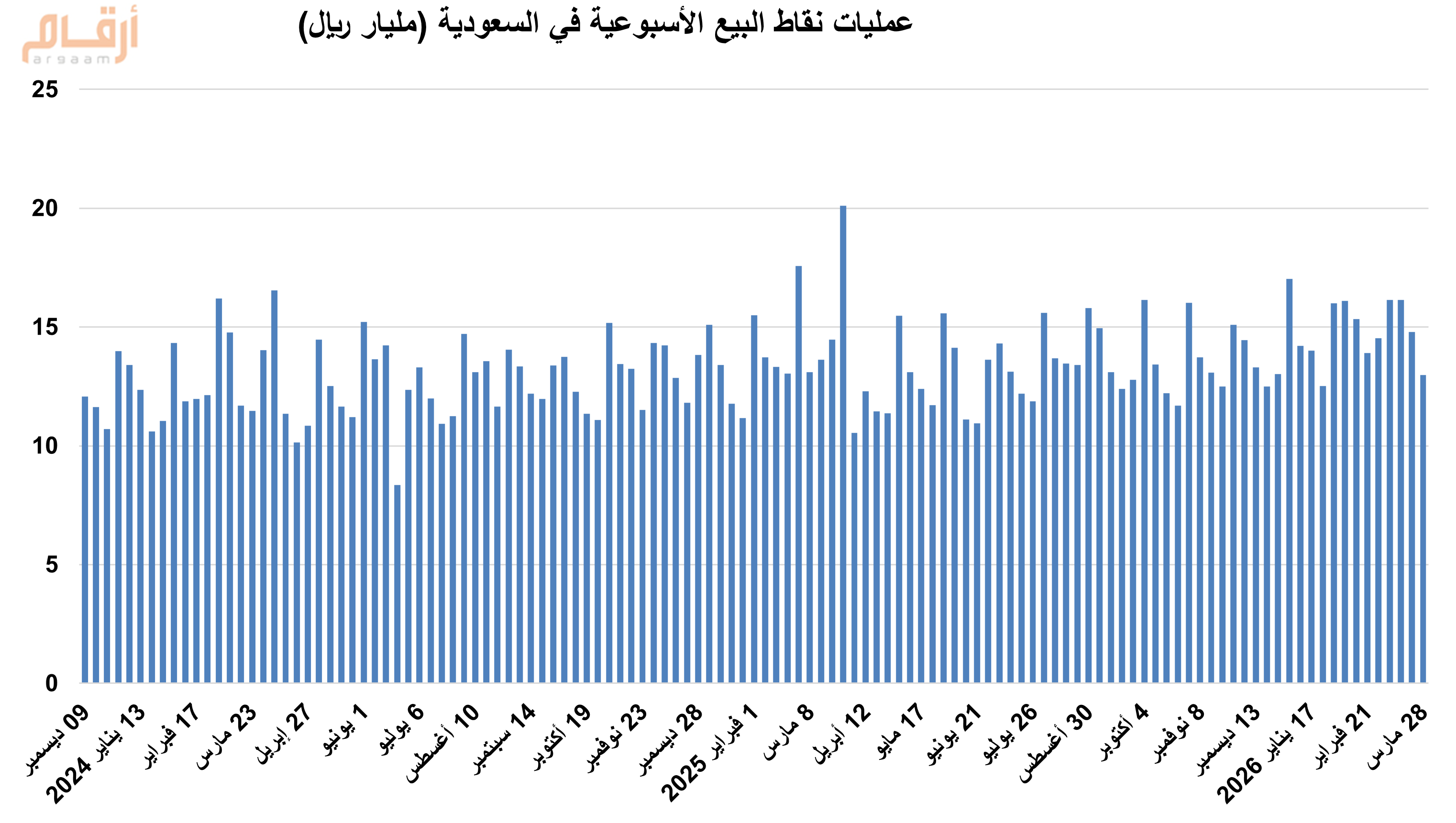 بلغت قيمة المبيعات عبر نقاط البيع في السعودية، نحو 13 مليار ريال خلال الأسبوع المنتهي في 28 مارس 2026، مقارنة بنحو 14.8 مليار ريال خلال الأسبوع الذي سبقه.
