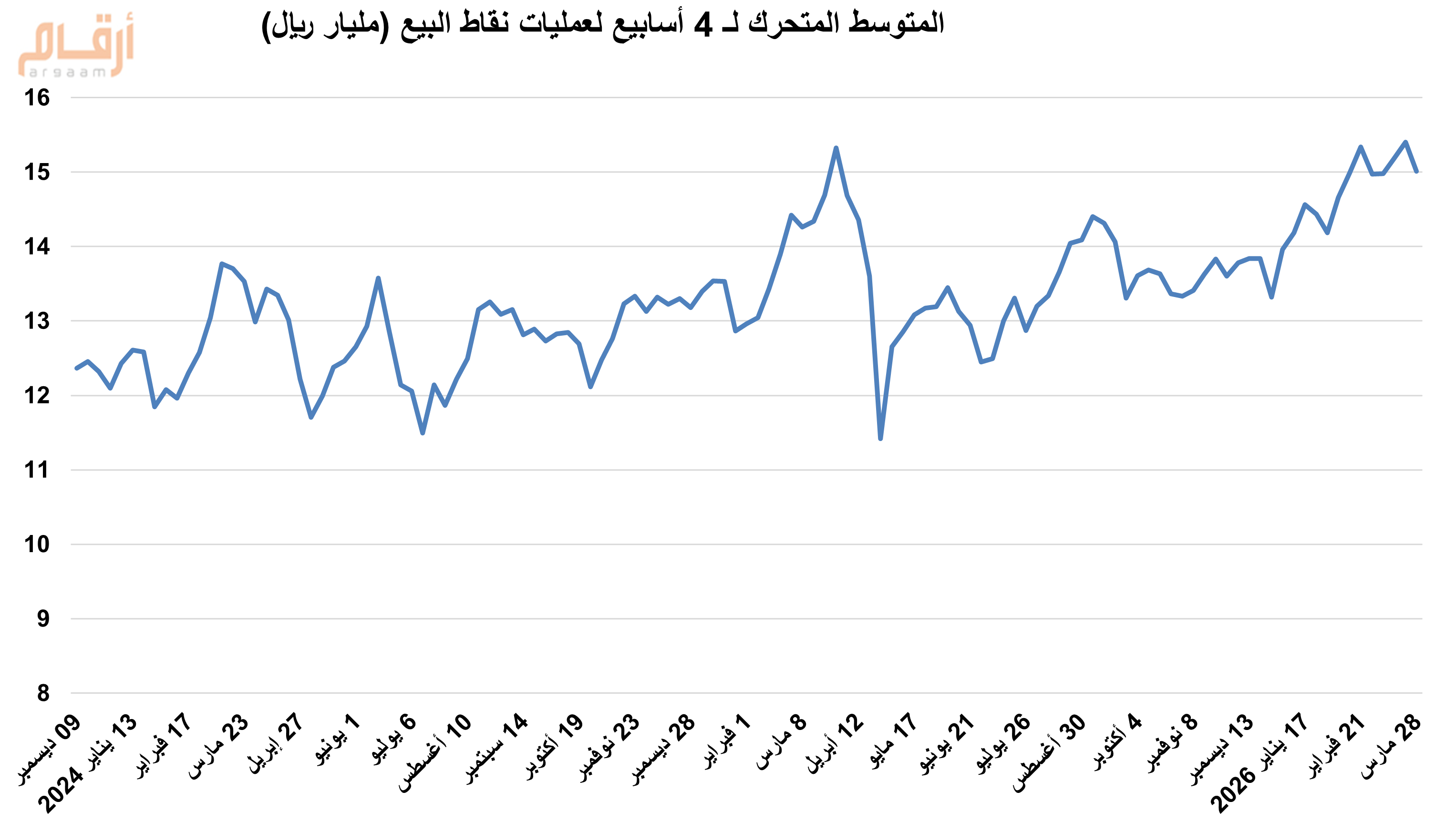 وبلغ المتوسط المتحرك لـ 4 أسابيع نحو 15 مليار ريال، وكان قيمة عمليات نقاط البيع قد ارتفعت خلال عام 2025 مقارنة بأعوام 2024 و2023 و2022، حيث تراوح متوسط قيمة المبيعات بين 11.4 و15.3 مليار ريال، فيما كان يتراوح بين 11.5 و13.8 مليار ريال في العام 2024 وبين 10.4 و12.7 مليار ريال في عام 2023 وما بين 9.4 و11.6 مليار ريال في عام 2022، كما يوضح الرسم التالي: