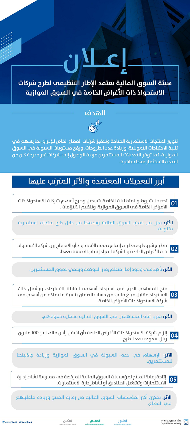 وحسب بيانات أرقام، كانت الهيئة قد نشرت في أبريل 2025 مشروع الإطار التنظيمي لإتاحة طرح شركات الاستحواذ ذات الأغراض الخاصة في السوق الموازية على المنصة الإلكترونية الموحدة لاستطلاع آراء العموم والجهات الحكومية التابعة للمركز الوطني للتنافسية (منصة استطلاع) وموقع الهيئة الإلكتروني لمدة 30 يوماً تقويمياً؛ لاستطلاع مرئيات العموم حياله.