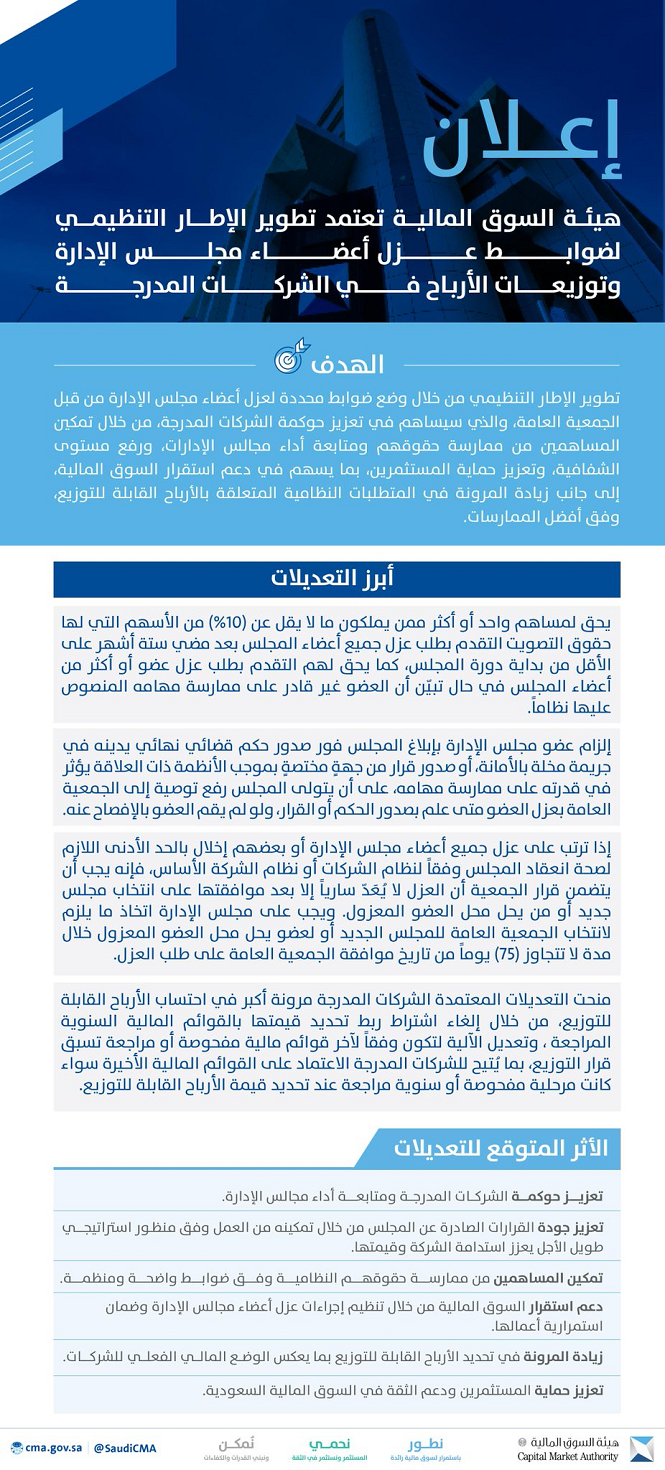 وبحسب بيان للهيئة يهدف تطوير الإطار التنظيمي إلى وضع ضوابط محددة لعزل أعضاء مجلس الإدارة من قبل الجمعية العامة، والذي سيساهم في تعزيز حوكمة الشركات المدرجة، من خلال تمكين المساهمين من ممارسة حقوقهم ومتابعة أداء مجالس الإدارات، ورفع مستوى الشفافية، وتعزيز حماية المستثمرين، بما يسهم في دعم استقرار السوق المالية، إلى جانب زيادة المرونة في المتطلبات النظامية المتعلقة بالأرباح القابلة للتوزيع.